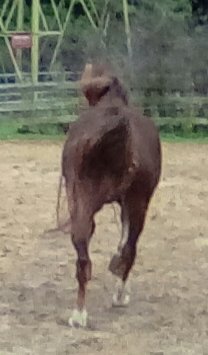We stopped to chat for a few minutes. Then, he went on our way and we went on ours. We didn’t get very far when I saw Dante’s head go straight up in the air. He started panicking. All I saw was him stepping backwards into the woods behind him. I think that is when he decided to spin towards us. All I knew is that Cole decided to spin and take off. Starry was in between us, and he half-heartedly followed Cole. Dante saw the commotion going on with us--and spun the opposite way. Poor Ellen got spun to the left--then spun to the right.